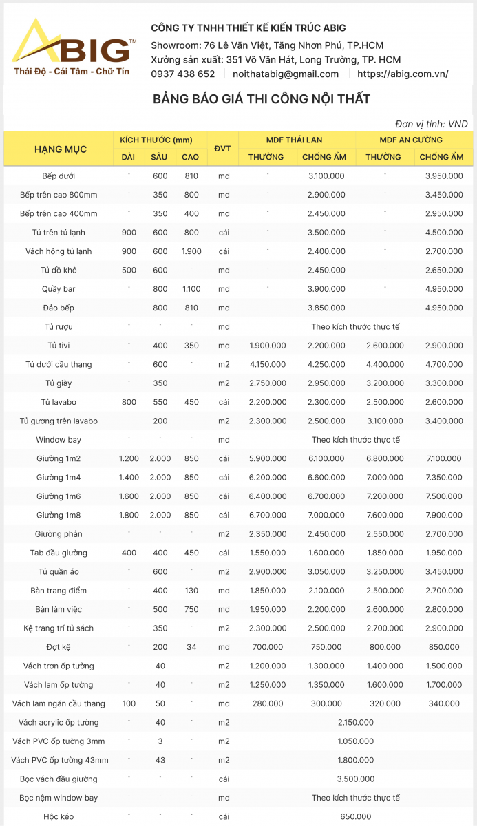 Dưới đây là bảng giá thi công nội thất nhà phố, nội thất chung cư, nội thất biệt thự với những thiết bị nội thất cơ bản mà ABIG đang triển khai, với 2 thương hiệu vật liệu được ABIG đánh giá là tốt nhất hiện nay.