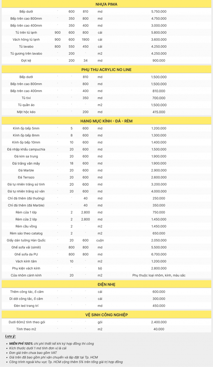 Báo giá thi công nội thất ở trên bao gồm: